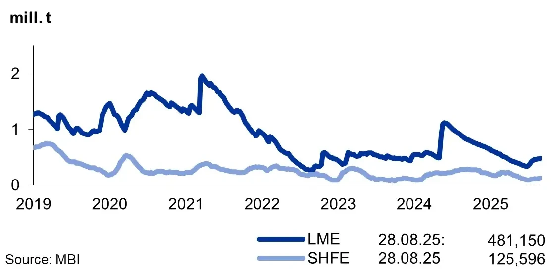 2025年8月における上海先物取引所(SHFE)およびロンドン金属取引所(LME)のアルミニウム在庫は、全体的に比較的一貫した動きを示しました。SHFEでは、月間平均在庫が8.5パーセント増加し、一方LMEでは同期間に6.7パーセント増加しました。